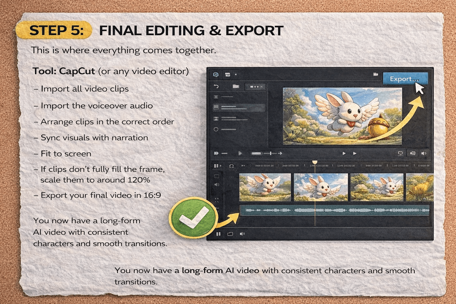 You now have a long-form AI video with consistent characters and smooth transitions.